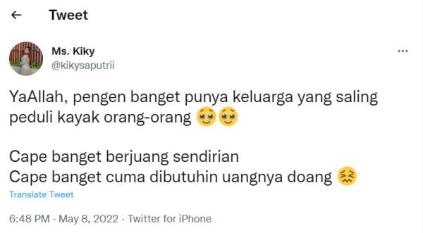 “Ya Allah, pengin banget punya keluarga yang saling peduli kayak orang-orang,” tulis Kiky dikutip pada Senin (9/5/2022). Kiky juga mengaku lelah karena merasa selama ini berjuang seorang diri.